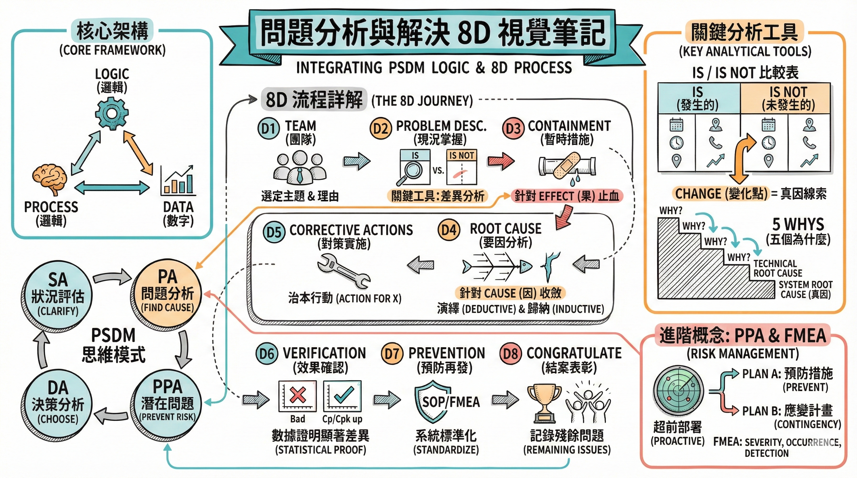 - 系統化流程:D1–D8 從「組隊」到「制度化」,避免只救火不收斂。